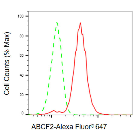 Flow cytometric analysis of ABCF2 expression in C2C12 cells using ABCF2 antibody. Green, isotype control; red, ABCF2.