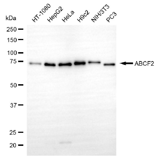 Western blotting analysis using ABCF2 antibody. Total cell lysates (30 μg) from various cell lines were loaded and separated by SDS-PAGE. The blot was incubated with ABCF2 antibody and HRP-conjugated goat anti-mouse secondary antibody respectively.