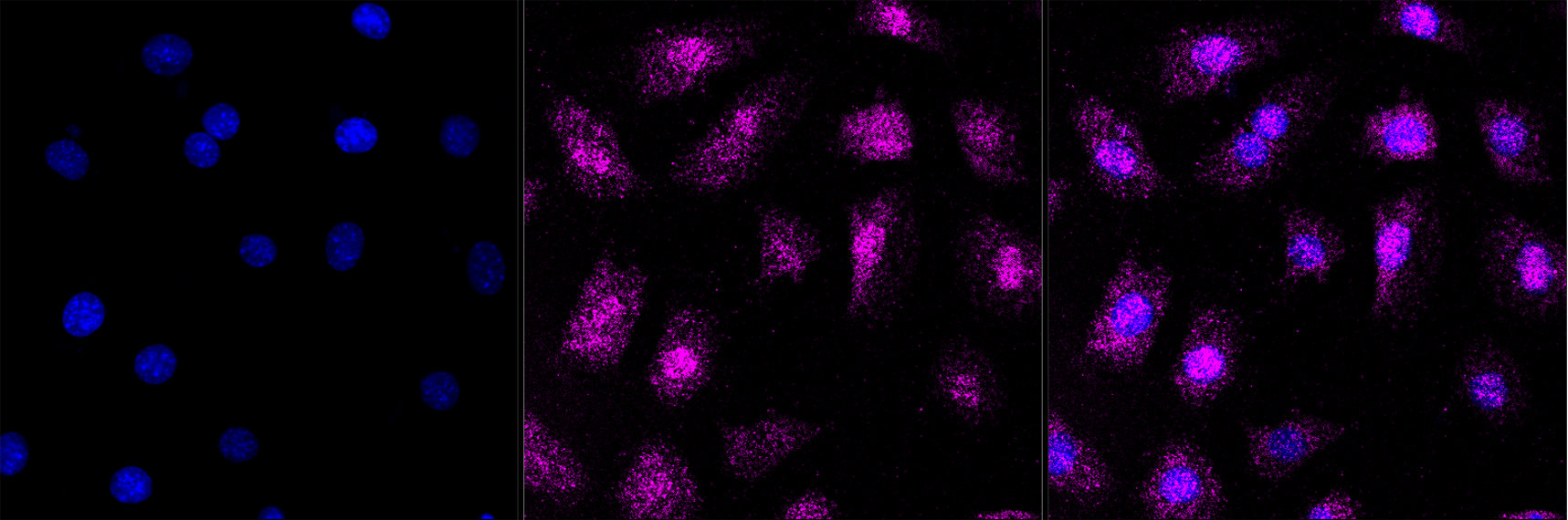 Immunocytochemical staining of C2C12 cells with ALDH1A1 antibody. Nuclei were stained blue with DAPI; ALDH1A1 was stained magenta with Alexa Fluor? 647. Images were taken using Leica stellaris 5. Protein abundance based on laser Intensity and smart gain: Low. Scale bar, 20 μm.