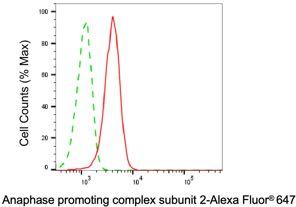 Flow cytometric analysis of Anaphase promoting complex subunit 2 expression in C2C12 cells using Anaphase promoting complex subunit 2 antibody. Green, isotype control; red, Anaphase promoting complex subunit 2.