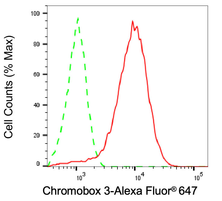 Flow cytometric analysis of Chromobox 3 expression in HepG2 cells using Chromobox 3 antibody. Green, isotype control; red, Chromobox 3.