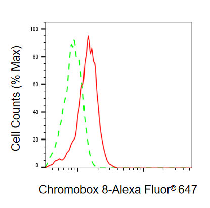Flow cytometric analysis of Chromobox 8 expression in HeLa cells using Chromobox 8 antibody. Green, isotype control; red, Chromobox 8.