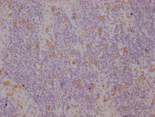 IHC image of CSB-MA942955 diluted at 1:100 and staining in paraffin-embedded human lymph node tissue performed on a Leica BondTM system. After dewaxing and hydration, antigen retrieval was mediated by high pressure in a citrate buffer (pH 6.0). Section was blocked with 10% normal goat serum 30min at RT. Then primary antibody (1% BSA) was incubated at 4°C overnight. The primary is detected by a Goat anti-mouse IgG polymer labeled by HRP and visualized using 0.05% DAB.