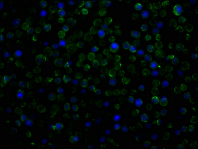 Immunofluorescence staining of THP-1 cells with CSB-MA017767A0m at 1:100, counter-stained with DAPI. The cells were blocked in 10% normal Goat Serum and then incubated with the primary antibody overnight at 4°C. The secondary antibody was Alexa Fluor 488-congugated AffiniPure Goat Anti-Mouse IgG(H+L).