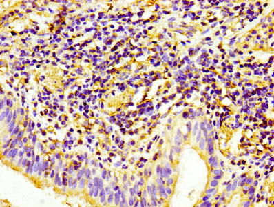 IHC image of CSB-MA017767A0m diluted at 1:100 and staining in paraffin-embedded human spleen tissue performed on a Leica BondTM system. After dewaxing and hydration, antigen retrieval was mediated by high pressure in a citrate buffer (pH 6.0). Section was blocked with 10% normal goat serum 30min at RT. Then primary antibody (1% BSA) was incubated at 4°C overnight. The primary is detected by a biotinylated secondary antibody and visualized using an HRP conjugated SP system.
