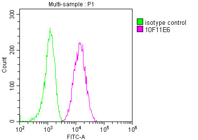 Overlay histogram showing Hela cells stained with CSB-MA004950A1m (red line) at 1:100. The cells were fixed in 4% formaldehyde and permeated by 0.2% TritonX-100. Then 10% normal goat serum was Incubated to block non-specific protein-protein interactions followed by the antibody (1μg/1*106cells) for 1 h at 4°C. The secondary antibody used was FITC-conjugated Goat Anti-Mouse IgG(H+L) at 1/100 dilution for 30min at 4°C. Isotype control antibody (green line) was mouse IgG2b (1μg/1*106cells) used under the same conditions. Acquisition of >10,000 events was performed.