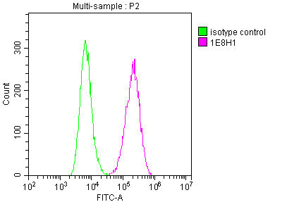 Overlay histogram showing Jurkat cells stained with CSB-MA004969A1m (red line) at 1:100. The cells were fixed in 4% formaldehyde and permeated by 0.2% TritonX-100. Then 10% normal goat serum was Incubated to block non-specific protein-protein interactions followed by the antibody (1μg/1*106cells) for 1 h at 4°C. The secondary antibody used was FITC-conjugated Goat Anti-Mouse IgG(H+L) at 1/100 dilution for 30min at 4°C. Isotype control antibody (green line) was mouse IgG1(1μg/1*106cells) used under the same conditions. Acquisition of >10,000 events was performed.
