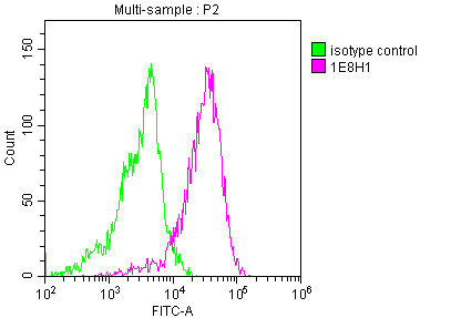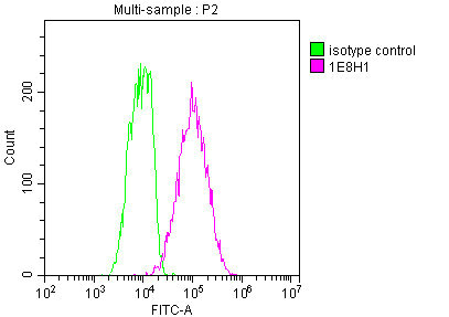 Overlay histogram showing PC-3 cells stained with CSB-MA004969A1m (red line) at 1:100. The cells were fixed in 4% formaldehyde and permeated by 0.2% TritonX-100. Then 10% normal goat serum was Incubated to block non-specific protein-protein interactions followed by the antibody (1μg/1*106cells) for 1 h at 4°C. The secondary antibody used was FITC-conjugated Goat Anti-Mouse IgG(H+L) at 1/100 dilution for 30min at 4°C. Isotype control antibody (green line) was mouse IgG1 (1μg/1*106cells) used under the same conditions. Acquisition of >10,000 events was performed.