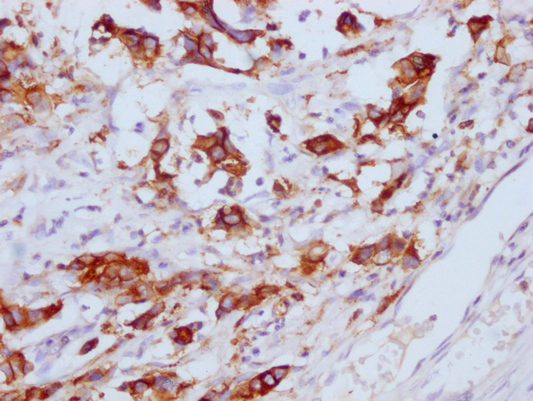 IHC image of CSB-MA995583 diluted at 1:100 and staining in paraffin-embedded human gastric cancer performed on a Leica BondTM system. After dewaxing and hydration, antigen retrieval was mediated by high pressure in a citrate buffer (pH 6.0). Section was blocked with 10% normal goat serum 30min at RT. Then primary antibody (1% BSA) was incubated at 4°C overnight. The primary is detected by a Goat anti-mouse IgG polymer labeled by HRP and visualized using 0.05% DAB.