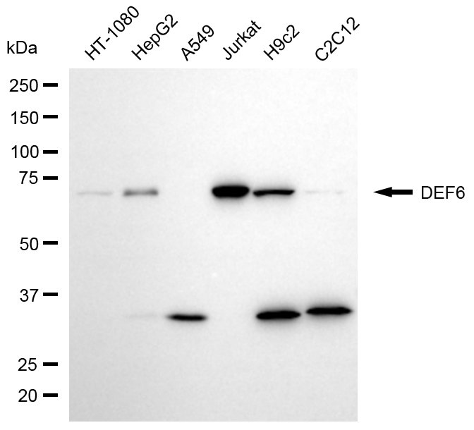 Western blotting analysis using DEF6 antibody. Total cell lysates (30 μg) from various cell lines were loaded and separated by SDS-PAGE. The blot was incubated with DEF6 antibody and HRP-conjugated goat anti-mouse secondary antibody respectively.