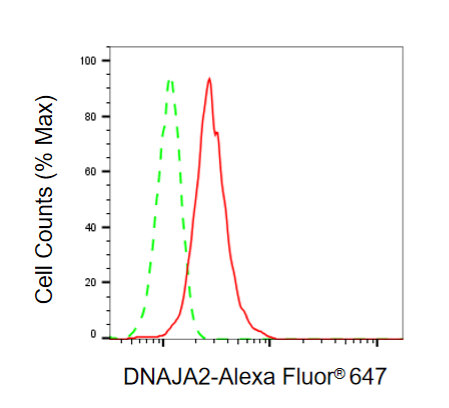 Flow cytometric analysis of DNAJA2 expression in C2C12 cells using DNAJA2 antibody. Green, isotype control; red, DNAJA2.