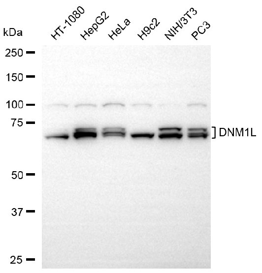 Western blotting analysis using DNM1L antibody. Total cell lysates (30 μg) from various cell lines were loaded and separated by SDS-PAGE. The blot was incubated with DNM1L antibody and HRP-conjugated goat anti-mouse secondary antibody respectively.
