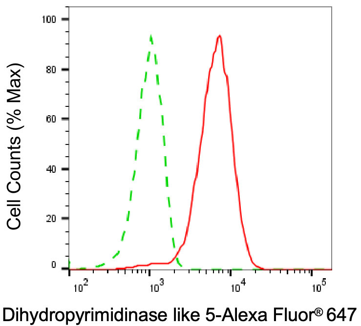 Flow cytometric analysis of Dihydropyrimidinase like 5 expression in HAP-1 cells using Dihydropyrimidinase like 5 antibody. Green, isotype control; red, Dihydropyrimidinase like 5.