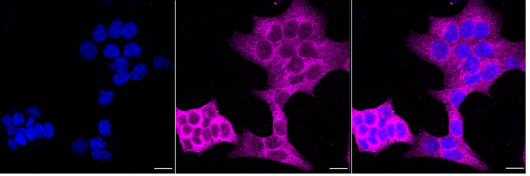 Immunocytochemical staining of HAP1 cells with Dihydropyrimidinase like 5 antibody. Nuclei were stained blue with DAPI;Dihydropyrimidinase like 5 was stained magenta with Alexa Fluor? 647. Images were taken using Leica stellaris 5. Protein abundance based on laser Intensity and smart gain: Medium. Scale bar, 20 μm.