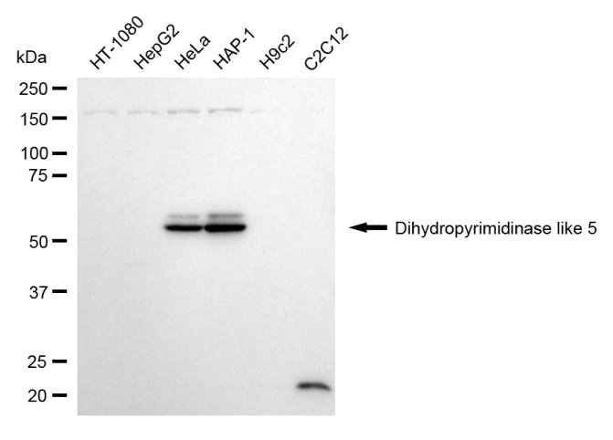 Western blotting analysis using dihydropyrimidinase like 5 antibody. Total cell lysates (30 μg) from various cell lines were loaded and separated by SDS-PAGE. The blot was incubated with dihydropyrimidinase like 5 antibody and HRP-conjugated goat anti-mouse secondary antibody respectively.