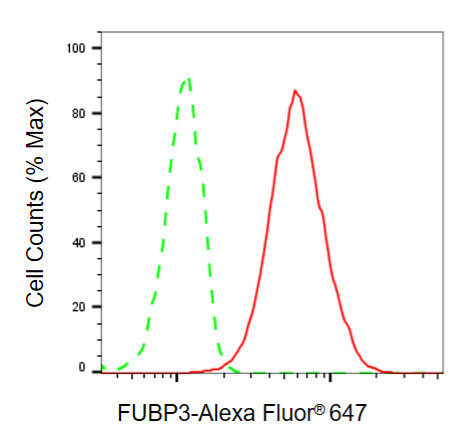 Flow cytometric analysis of FUBP3 expression in HT-1080 cells using FUBP3 antibody. Green, isotype control; red, FUBP3.