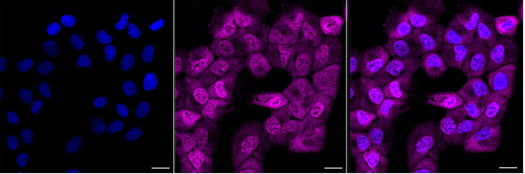 Immunocytochemical staining of HT-1080 cells with FUBP3 antibody. Nuclei were stained blue with DAPI; FUBP3 was stained magenta with Alexa Fluor? 647. Images were taken using Leica stellaris 5. Protein abundance based on laser Intensity and smart gain: Medium. Scale bar, 20 μm.