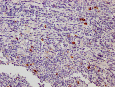 IHC image of CSB-MA012719A0m diluted at 1:500 and staining in paraffin-embedded human appendix tissue performed on a Leica BondTM system. After dewaxing and hydration, antigen retrieval was mediated by high pressure in a citrate buffer (pH 6.0). Section was blocked with 10% normal goat serum 30min at 37°C Then primary antibody (1% BSA) was incubated at 4°C overnight. The primary is detected by a Goat anti-Mouse IgG labeled by HRP and visualized using 0.05% DAB.