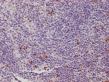 IHC image of CSB-MA012719A0m diluted at 1:500 and staining in paraffin-embedded human tonsil tissue performed on a Leica BondTM system. After dewaxing and hydration, antigen retrieval was mediated by high pressure in a citrate buffer (pH 6.0). Section was blocked with 10% normal goat serum 30min at 37°C Then primary antibody (1% BSA) was incubated at 4°C overnight. The primary is detected by a Goat anti-Mouse IgG labeled by HRP and visualized using 0.05% DAB.
