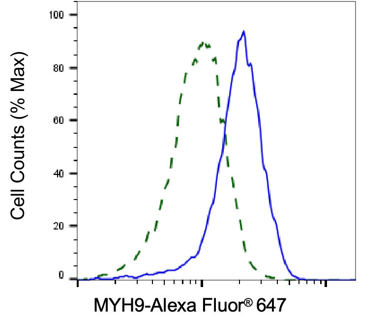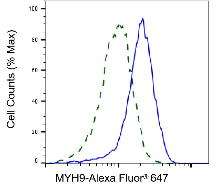 Validation of MYH9 knockdown using flow cytometry. Wild-type(WT, Blue) and knockdown(KD, Green) HeLa cells were stained with MYH9 antibody and analyzed using BD flow cytometer.