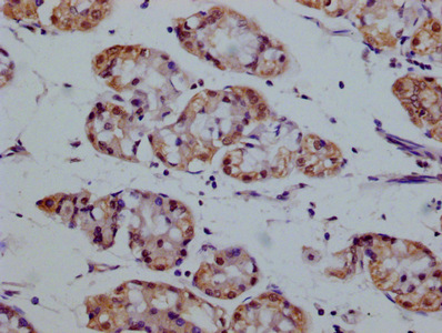 IHC image of CSB-MA875720A0m diluted at 1:100 and staining in paraffin-embedded human stomach tissue performed on a Leica BondTM system. After dewaxing and hydration, antigen retrieval was mediated by high pressure in a citrate buffer (pH 6.0). Section was blocked with 10% normal goat serum 30min at RT. Then primary antibody (1% BSA) was incubated at 4°C overnight. The primary is detected by a biotinylated secondary antibody and visualized using an HRP conjugated SP system.