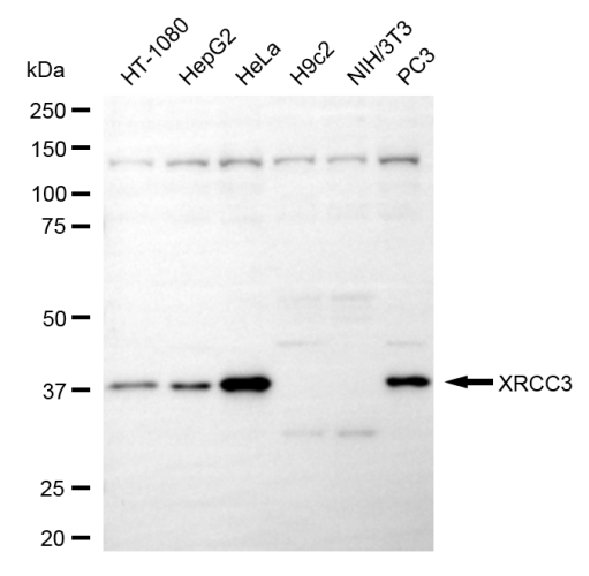 Western blotting analysis using anti-XRCC3 antibody. Total cell lysates (30 μg) from various cell lines were loaded and separated by SDS-PAGE. The blot was incubated with anti-XRCC3 antibody and HRP-conjugated goat anti-mouse secondary antibody respectively.