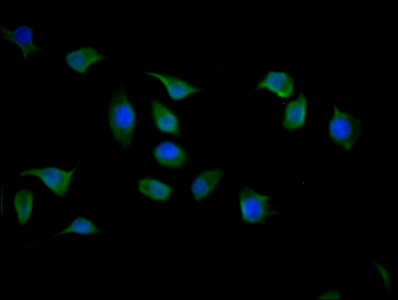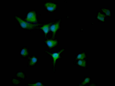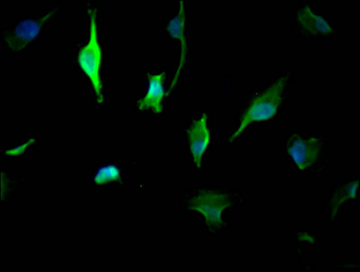 Immunofluorescence staining of U251 cells with CSB-MA026293A0m at 1:50, counter-stained with DAPI. The cells were fixed in 4% formaldehyde and blocked in 10% normal Goat Serum. The cells were then incubated with the antibody overnight at 4°C. Nuclear DNA was labeled in blue with DAPI. The secondary antibody was FITC-conjugated AffiniPure Goat Anti-Mouse IgG (H+L).