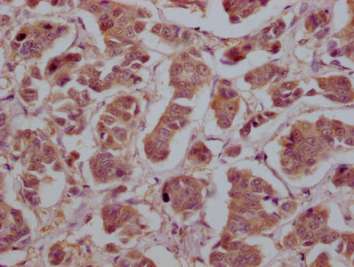 IHC image of CSB-MA026293A0m diluted at 1:200 and staining in paraffin-embedded human breast cancer tissue performed on a Leica BondTM system. After dewaxing and hydration, antigen retrieval was mediated by high pressure in a citrate buffer (pH 6.0). Section was blocked with 10% normal goat serum 30min at 37°C. Then primary antibody (1% BSA) was incubated at 4°C overnight. The primary is detected by a Goat anti-rabbit IgG labeled by HRP and visualized using 0.05% DAB.