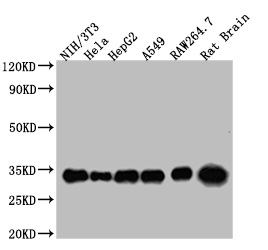 Positive WB detected in: NIH/3T3 whole cell lysate, Hela whole cell lysate, HepG2 whole cell lysate, A549 whole cell lysate, RAW264.7 whole cell lysate, Rat Brain tissue