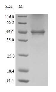 The recombinant Aquaporin-1/AQP1 was produced as a fusion protein with N-terminal 6xHis-SUMO tagged in vitro E.coli expression system. The encoding sequence contains 2-269aa of human AQP1 protein. This full-length of mature AQP1 protein reached up to 90% in purity, which is determined by SDS-PAGE. It migrated to a molecular mass band of 45 kDa on the gel. The slightly higher result is attributed to glycosylation. And it was also verified with a high activity assessed by its binding ability in a functional ELISA. This recombinant AQP1 protein may be used to synthesize anti-AQP1 antibodies or in the studies of AQP1-mediated signal transduction.