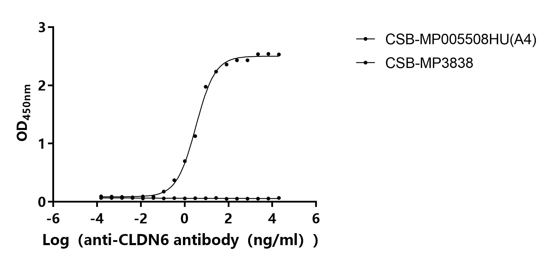 Measured by its binding ability in a functional ELISA. Immobilized Human CLDN6 at 2 μg/ml can bind Anti-CLDN6 recombinant antibody(CSB-RA005508MA4HU). The EC50 is 2.866-3.739 ng/mL.The VLPs (CSB-MP3838) is negative control. Biological Activity Assay