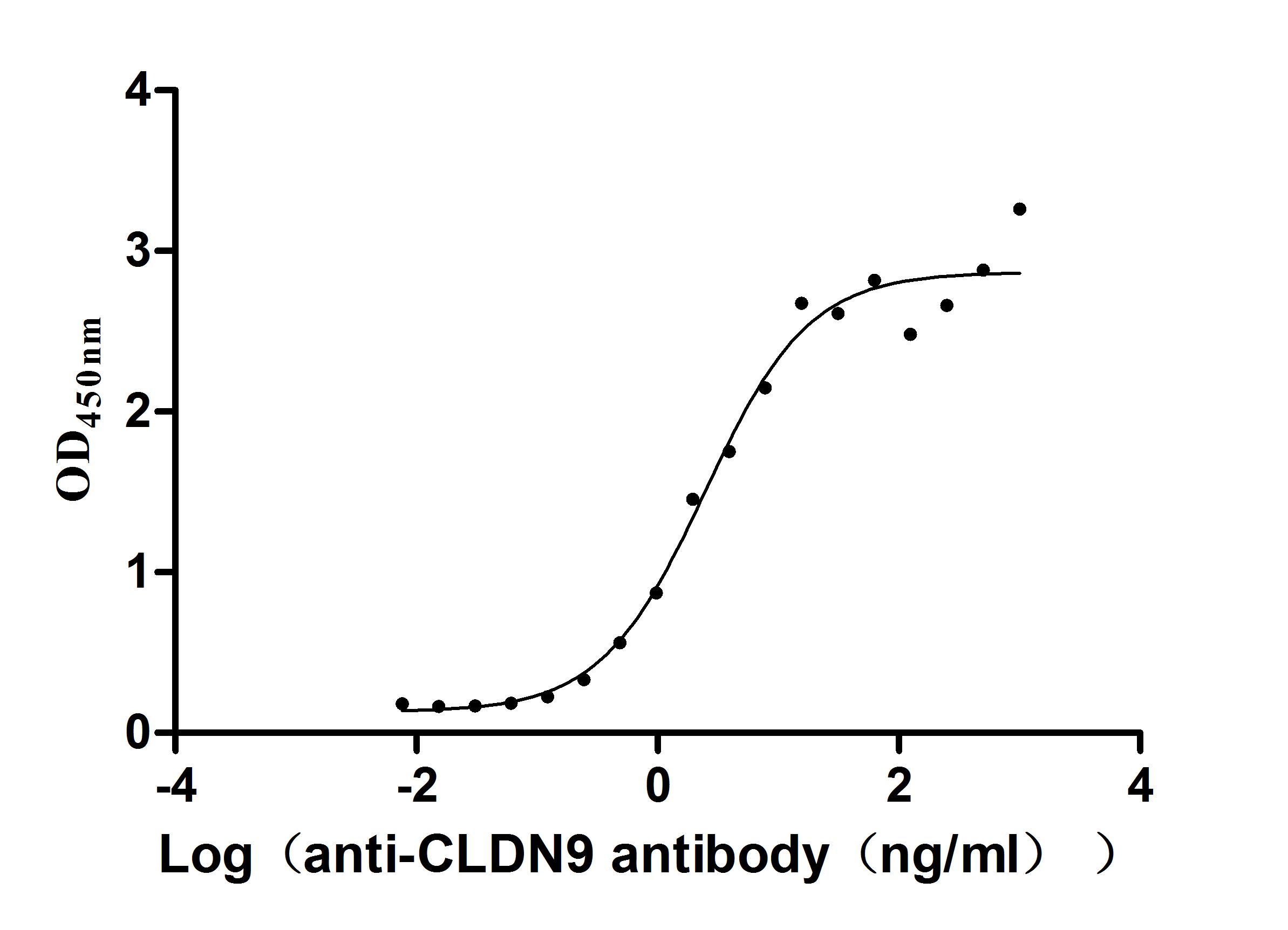 Measured by its binding ability in a functional ELISA. Immobilized Human CLDN6 at 2 μg/ml can bind Anti-CLDN6/9 recombinant antibody(CSB-RA005508MA3HU). The EC50 is 3.482-4.097 ng/mL.The VLPs (CSB-MP3838) is negative control. Biological Activity Assay -