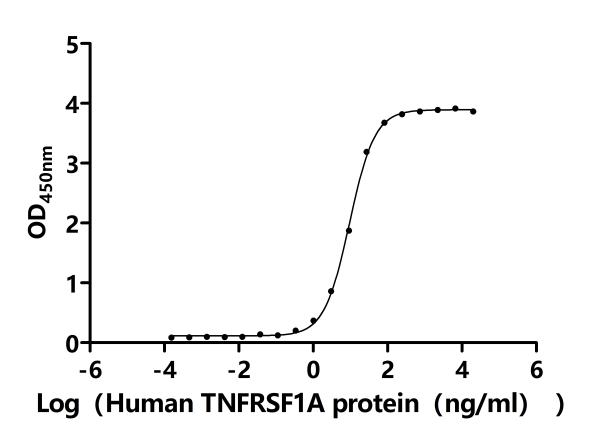 Measured by its binding ability in a functional ELISA.Immobilized Macaca mulatta TNF at 2 μg/ml can bind Human TNFRSF1A(CSB-MP023977HU1). The EC50 is 9.112-9.954 ng/mL. Biological Activity Assay