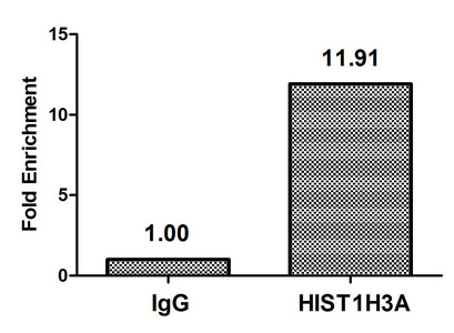 Chromatin Immunoprecipitation Hela (4*106, treated with 30mM sodium 3-hydroxybutyrate for 4h) were treated with Micrococcal Nuclease, sonicated, and immunoprecipitated with 5μg anti-HIST1H3A (CSB-PA010418OA27bhbHU) or a control normal rabbit IgG. The resulting ChIP DNA was quantified using real-time PCR with primers against the β-Globin promoter.