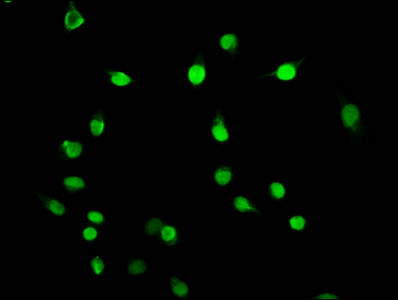 Immunofluorescence staining of Hela cells with CSB-PA010418OA79bhbHU at 1:5, counter-stained with DAPI. The cells were fixed in 4% formaldehyde, permeabilized using 0.2% Triton X-100 and blocked in 10% normal Goat Serum. The cells were then incubated with the antibody overnight at 4°C. The secondary antibody was Alexa Fluor 488-congugated AffiniPure Goat Anti-Rabbit IgG(H+L).
