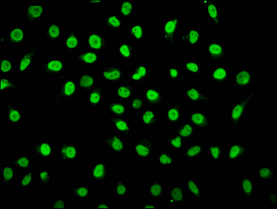 Immunofluorescence staining of Hela cells (treated with 30mM sodium butyrate for 4h) with CSB-PA010378OA25hibHU at 1:5, counter-stained with DAPI. The cells were fixed in 4% formaldehyde, permeabilized using 0.2% Triton X-100 and blocked in 10% normal Goat Serum. The cells were then incubated with the antibody overnight at 4°C. The secondary antibody was Alexa Fluor 488-congugated AffiniPure Goat Anti-Rabbit IgG(H+L).