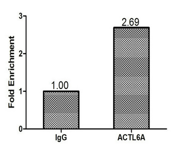 Chromatin Immunoprecipitation MCF-7 (1.1*106) were cross-linked with formaldehyde, sonicated, and immunoprecipitated with 4μg anti-ACTL6A or a control normal rabbit IgG. The resulting ChIP DNA was quantified using real-time PCR with primers (CSB-PP001236HU) against the TFF1 promoter.