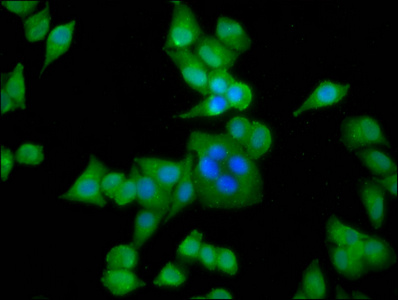 Immunofluorescence staining of Hela cells with CSB-PA001243LA01HU at 1:133, counter-stained with DAPI. The cells were fixed in 4% formaldehyde, permeabilized using 0.2% Triton X-100 and blocked in 10% normal Goat Serum. The cells were then incubated with the antibody overnight at 4°C. The secondary antibody was Alexa Fluor 488-congugated AffiniPure Goat Anti-Rabbit IgG(H+L).