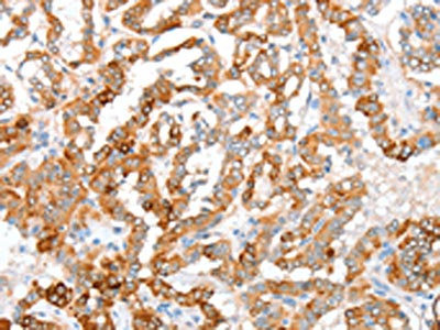 The image on the left is immunohistochemistry of paraffin-embedded Human thyroid cancer tissue using CSB-PA587551(ACY3 Antibody) at dilution 1/35, on the right is treated with fusion protein. (Original magnification: ×200)