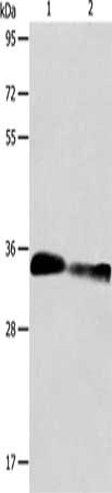 Gel: 10%SDS-PAGE, Lysate: 40 μg, Lane 1-2: Mouse kidney tissue, rat kidney tissue, Primary antibody: CSB-PA587551(ACY3 Antibody) at dilution 1/750, Secondary antibody: Goat anti rabbit IgG at 1/8000 dilution, Exposure time: 10 seconds
