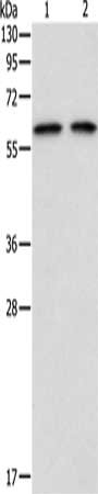Gel: 8%SDS-PAGE, Lysate: 40 μg, Lane 1-2: 293T cells, hela cells, Primary antibody: CSB-PA236720(ADAM2 Antibody) at dilution 1/300, Secondary antibody: Goat anti rabbit IgG at 1/8000 dilution, Exposure time: 15 seconds
