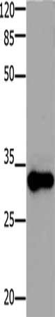Gel: 10%SDS-PAGE, Lysate: 30 μg, Lane: Mouse testis tissue, Primary antibody: CSB-PA934409(ADO Antibody) at dilution 1/1200, Secondary antibody: Goat anti rabbit IgG at 1/8000 dilution, Exposure time: 30 minutes