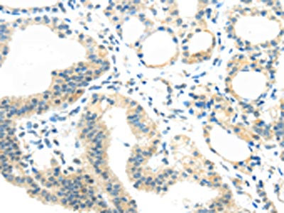 The image on the left is immunohistochemistry of paraffin-embedded Human thyroid cancer tissue using CSB-PA225304(AEBP1 Antibody) at dilution 1/25, on the right is treated with synthetic peptide. (Original magnification: ×200)