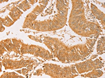 The image on the left is immunohistochemistry of paraffin-embedded Human colon cancer tissue using CSB-PA443063(AK2 Antibody) at dilution 1/40, on the right is treated with fusion protein. (Original magnification: ×200)