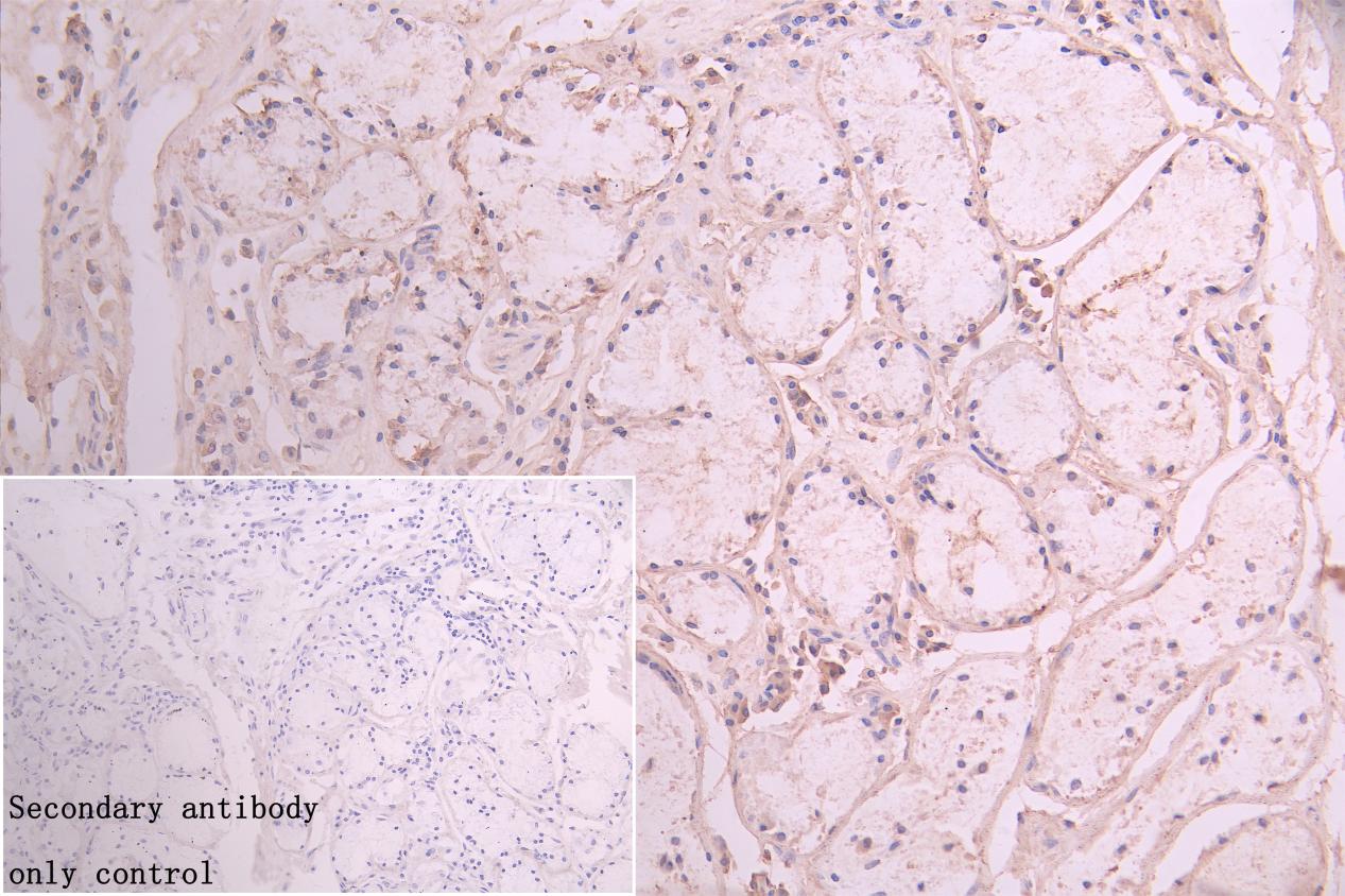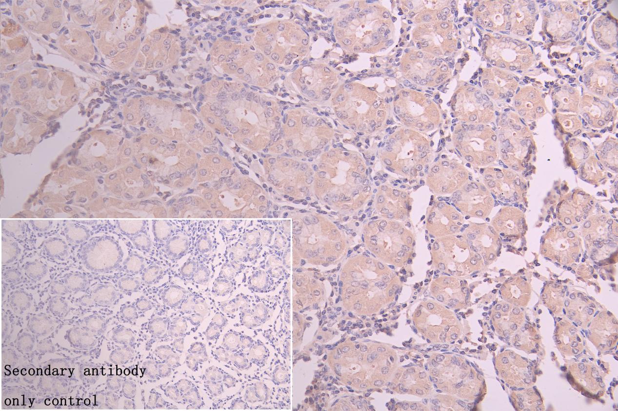 IHC image of CSB-PA857882LA01HU diluted at 1:250 and staining in paraffin-embedded human stomach tissue performed on a Leica BondTM system. After dewaxing and hydration, antigen retrieval was mediated by high pressure in a citrate buffer (pH 6.0). Section was blocked with 10% normal goat serum 30min at RT. Then primary antibody (1% BSA) was incubated at 4°C overnight. The primary is detected by a Goat anti-rabbit polymer IgG labeled by HRP and visualized using 0.05% DAB. Secondary antibody only control: uses 1% BSA instead of primary antibody