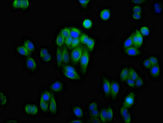 Immunofluorescence staining of HepG2 cells with CSB-PA001542LA01HU at 1:100, counter-stained with DAPI. The cells were fixed in 4% formaldehyde, permeabilized using 0.2% Triton X-100 and blocked in 10% normal Goat Serum. The cells were then incubated with the antibody overnight at 4°C. The secondary antibody was Alexa Fluor 488-congugated AffiniPure Goat Anti-Rabbit IgG(H+L).