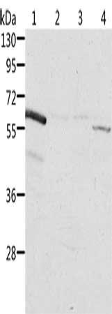 Gel: 10%SDS-PAGE, Lysate: 40 μg, Lane 1-4: Rat kidney tissue, human fetal kidney tissue, Jurkat cells, K562 cells, Primary antibody: CSB-PA280938(ALDH6A1 Antibody) at dilution 1/450, Secondary antibody: Goat anti rabbit IgG at 1/8000 dilution, Exposure time: 20 seconds