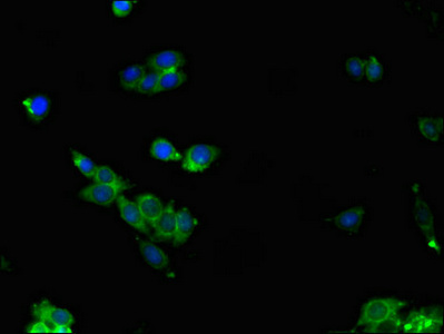 Immunofluorescent analysis of HepG2 cells using CSB-PA05659A0Rb at dilution of 1:100 and Alexa Fluor 488-congugated AffiniPure Goat Anti-Rabbit IgG(H+L)