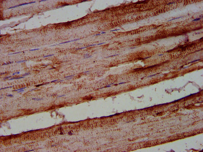 IHC image of CSB-PA001617LA01HU diluted at 1:500 and staining in paraffin-embedded human skeletal muscle tissue performed on a Leica BondTM system. After dewaxing and hydration, antigen retrieval was mediated by high pressure in a citrate buffer (pH 6.0). Section was blocked with 10% normal goat serum 30min at RT. Then primary antibody (1% BSA) was incubated at 4°C overnight. The primary is detected by a biotinylated secondary antibody and visualized using an HRP conjugated SP system.