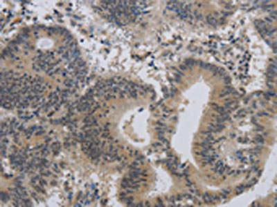 The image on the left is immunohistochemistry of paraffin-embedded Human colon cancer tissue using CSB-PA992612(ALX4 Antibody) at dilution 1/20, on the right is treated with synthetic peptide. (Original magnification: ×200)